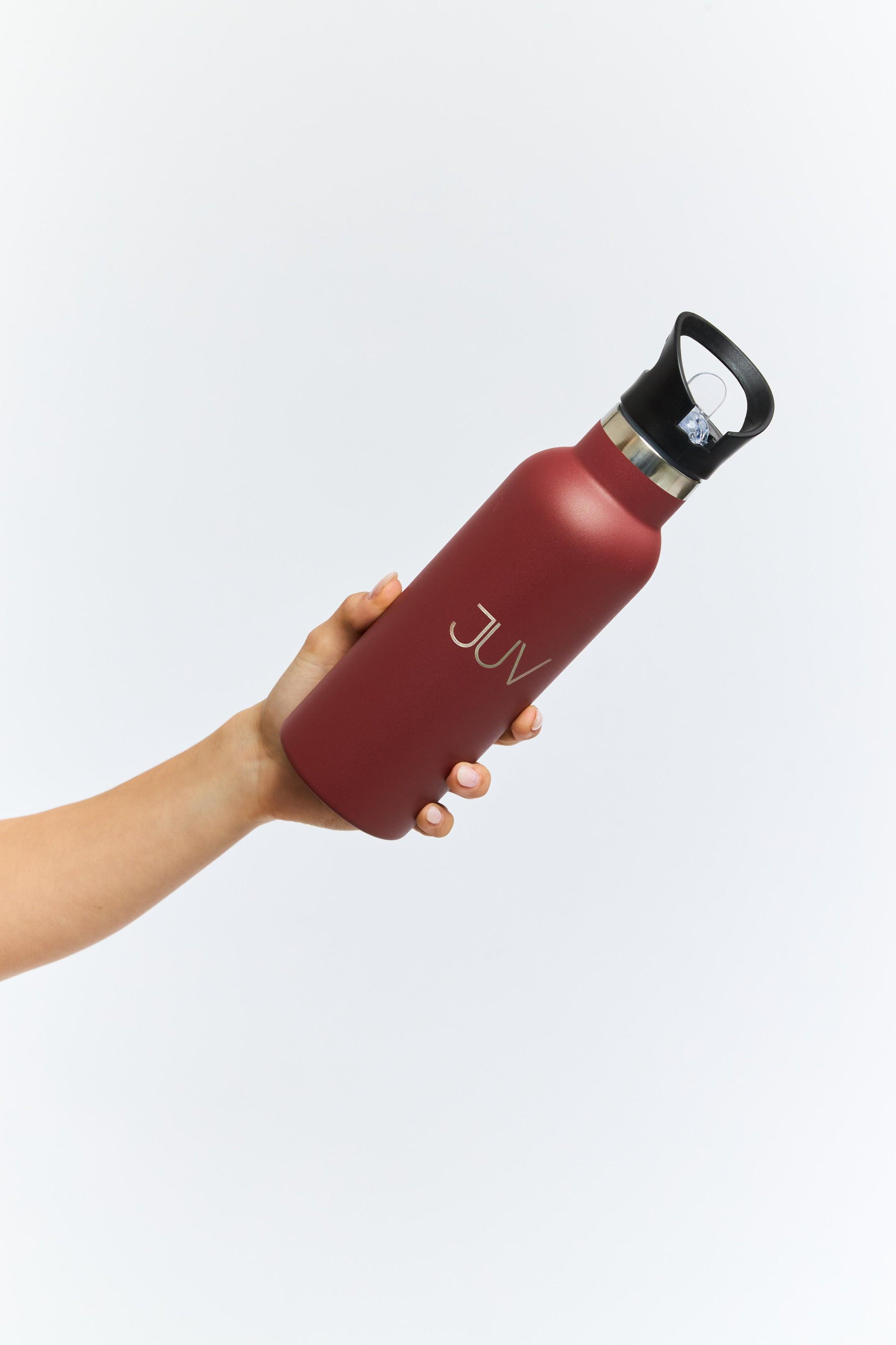 בקבוק שתיה מעוצב עשוי נירוסטה עם קשית מתקפלת וידית אחיזה.