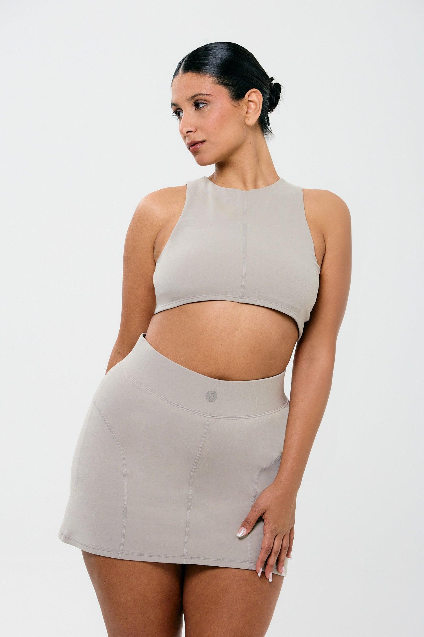Cropped tank top with a high, rounded back and delicate stitching.