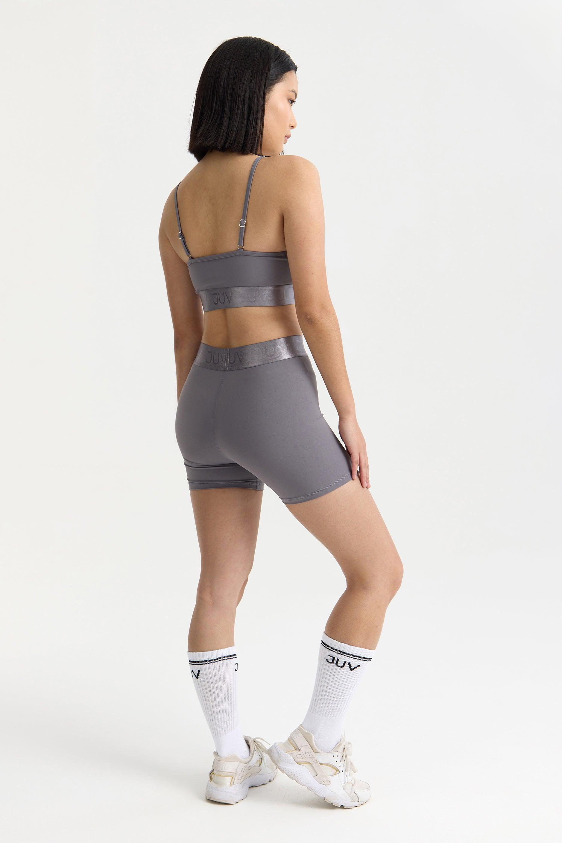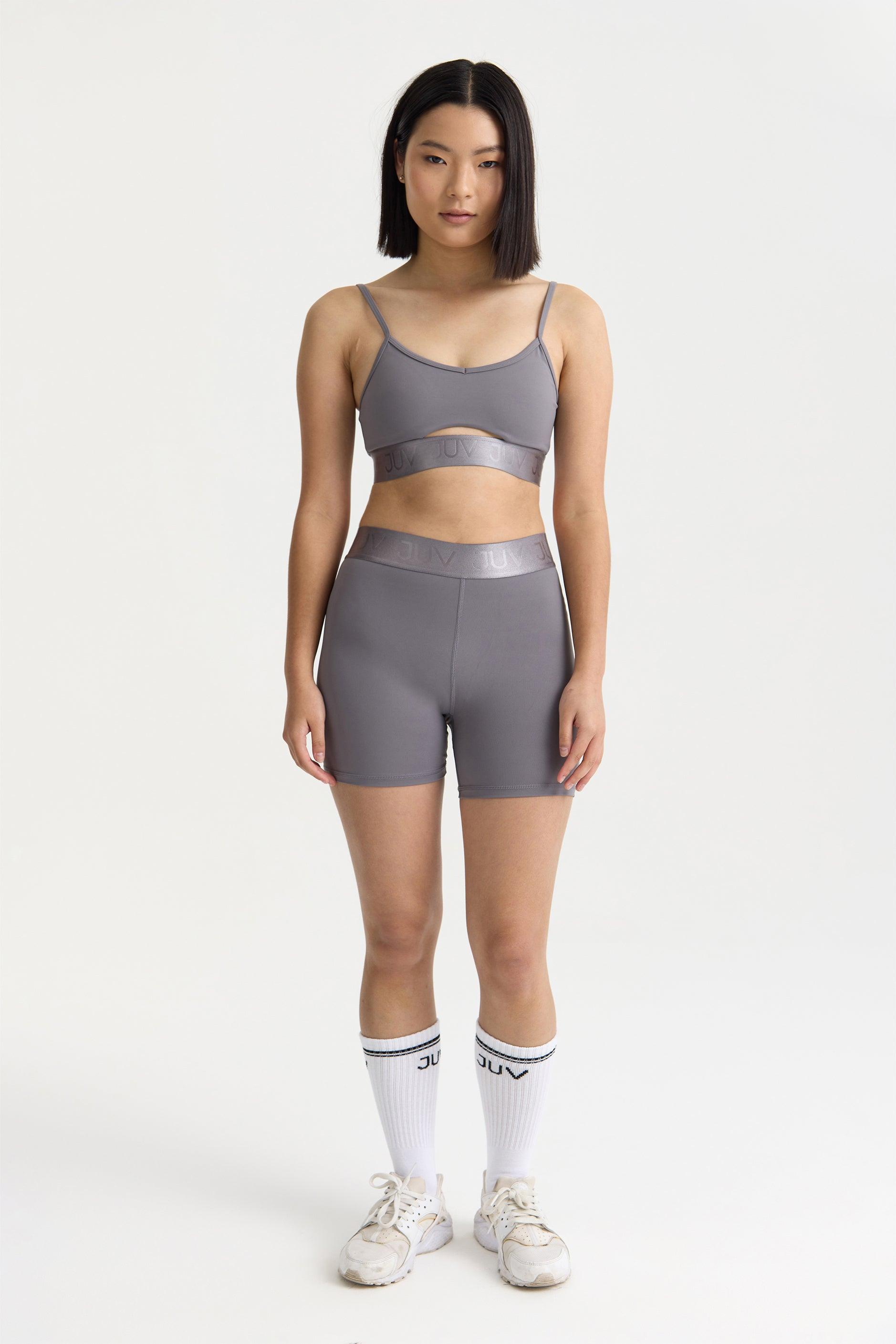 Short tights with a belt at the navel level. The tights have an elastic waistband with a logo print and a short biker length.